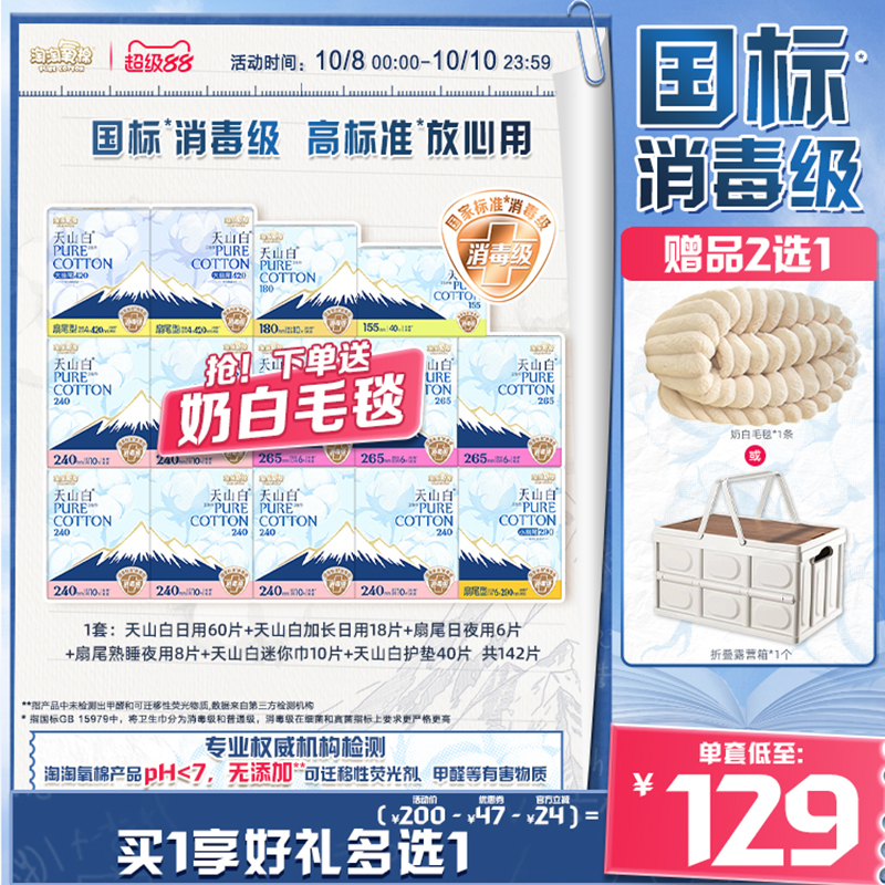 赠奶白毛毯【国标消毒级】淘淘氧棉天山白消毒级纯棉卫生巾组合